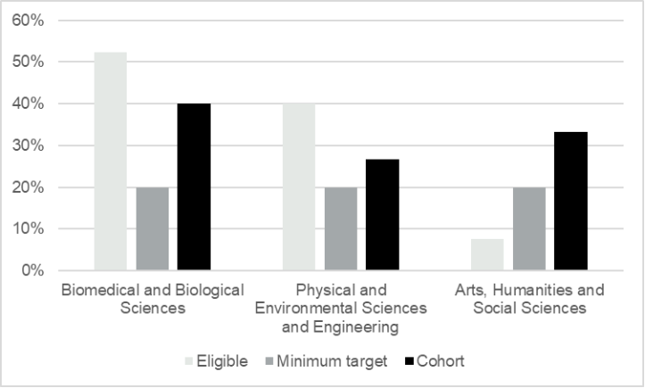 We met our target of a minimum of 20% of the cohort from each disciplinary area. The proportion of applications we received was greatest from Biomedical and Biological Sciences (38%) > Arts, Humanities and Social Sciences (31%) = Physical and Environmental Sciences and Engineering (31%). This is an improvement in terms of the proportion of applications from Physical and Environmental Sciences and Engineering, which we had sought to increase from the previous (2025) cohort.